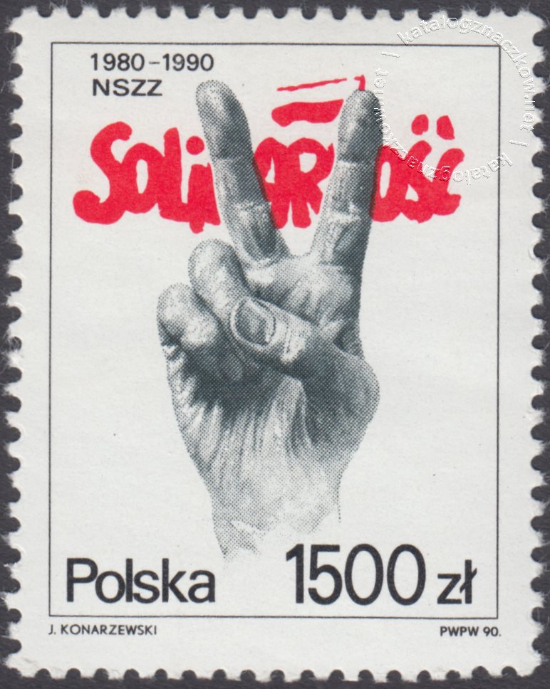 Opis: Ręka z palcami w kształcie litery V i napis 'Solidarność’