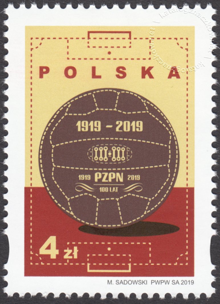 Opis: Piłka nożna wkomponowana w schemat boiska piłkarskiego, a na tle piki umieszczono logotyp obchodów jubileuszu Polskiego Związku Pliki Nożnej oraz lata jego istnienia: 1919-2019