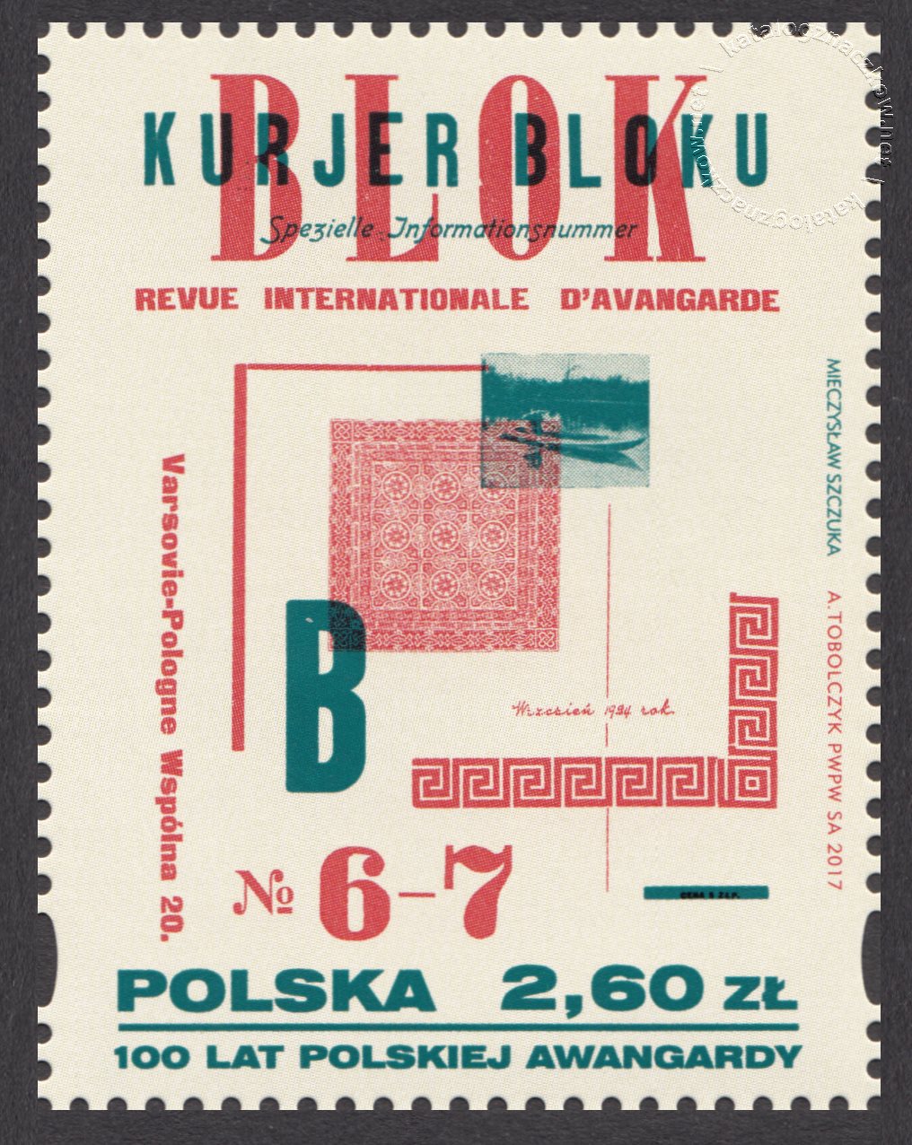 Opis: Na znaczku przedstawiono okładkę pisma Kurier Bloku autorstwa Mieczysława Szczuka