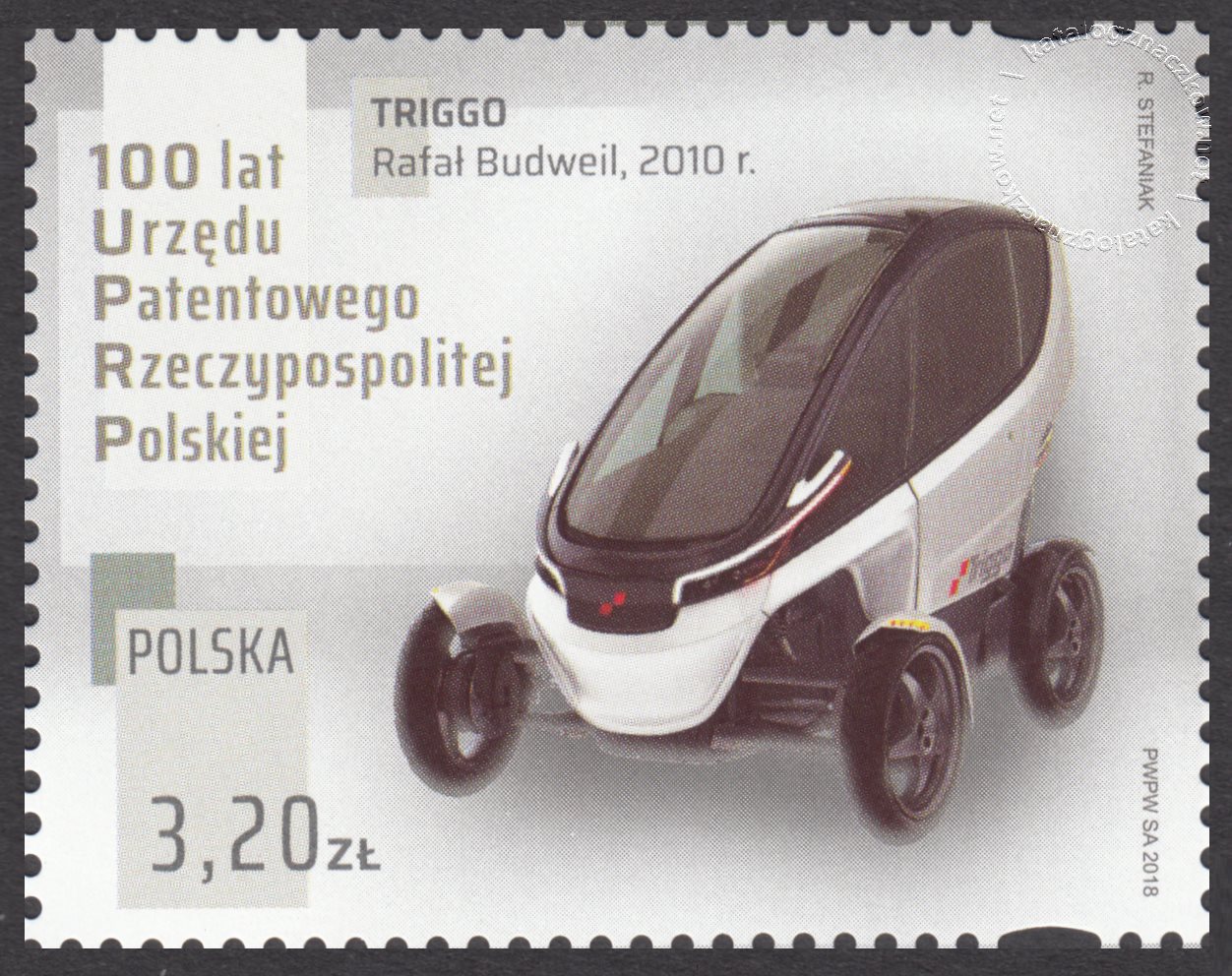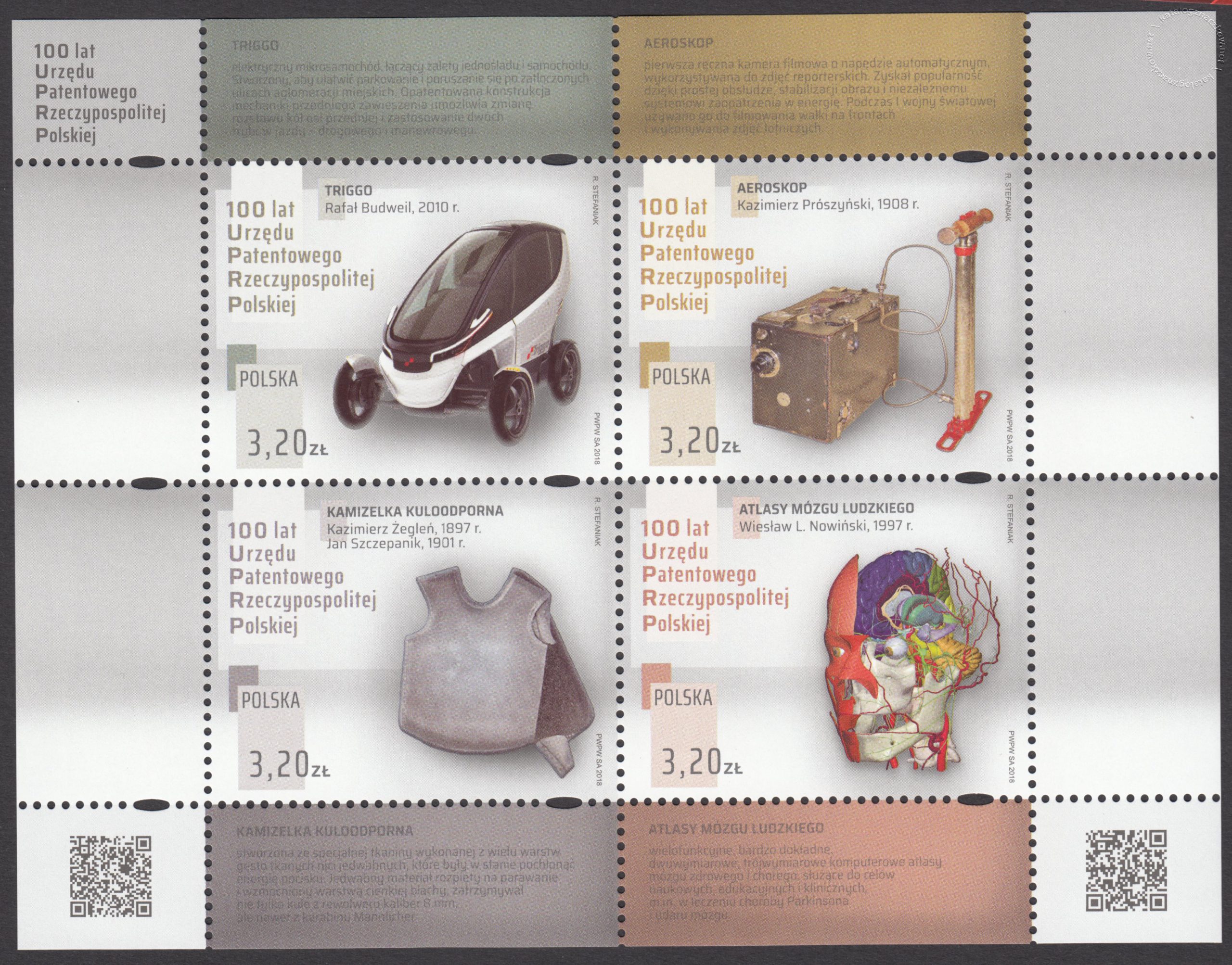 Opis: Na znaczku przedstawiono: na pierwszym pojazd Triggo, na drugim aeroskop, na trzecim kamizelkę kuloodporną, na czwartym atlasy mózgu ludzkiego