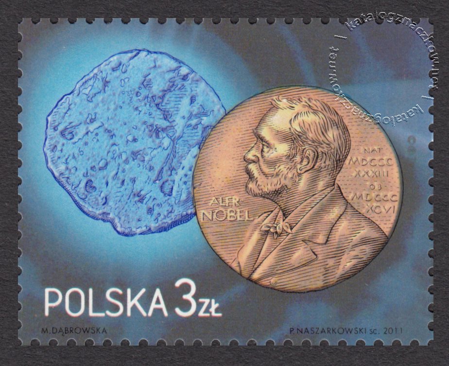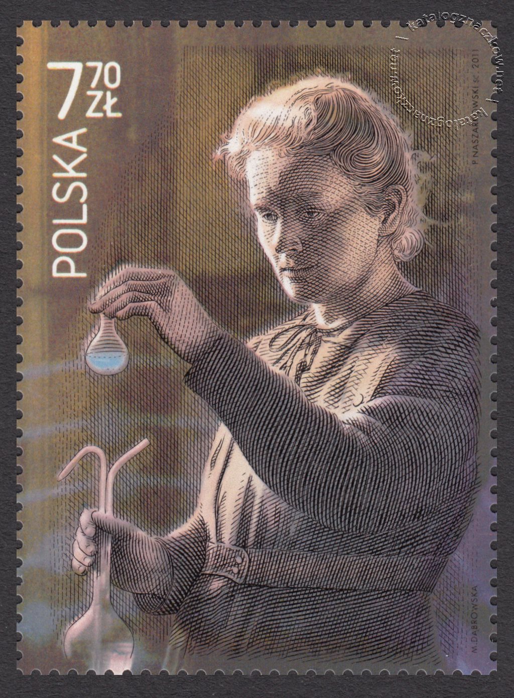 Opis: Maria Skłodowska-Curie trzymająca w dłoniach szklane kolby