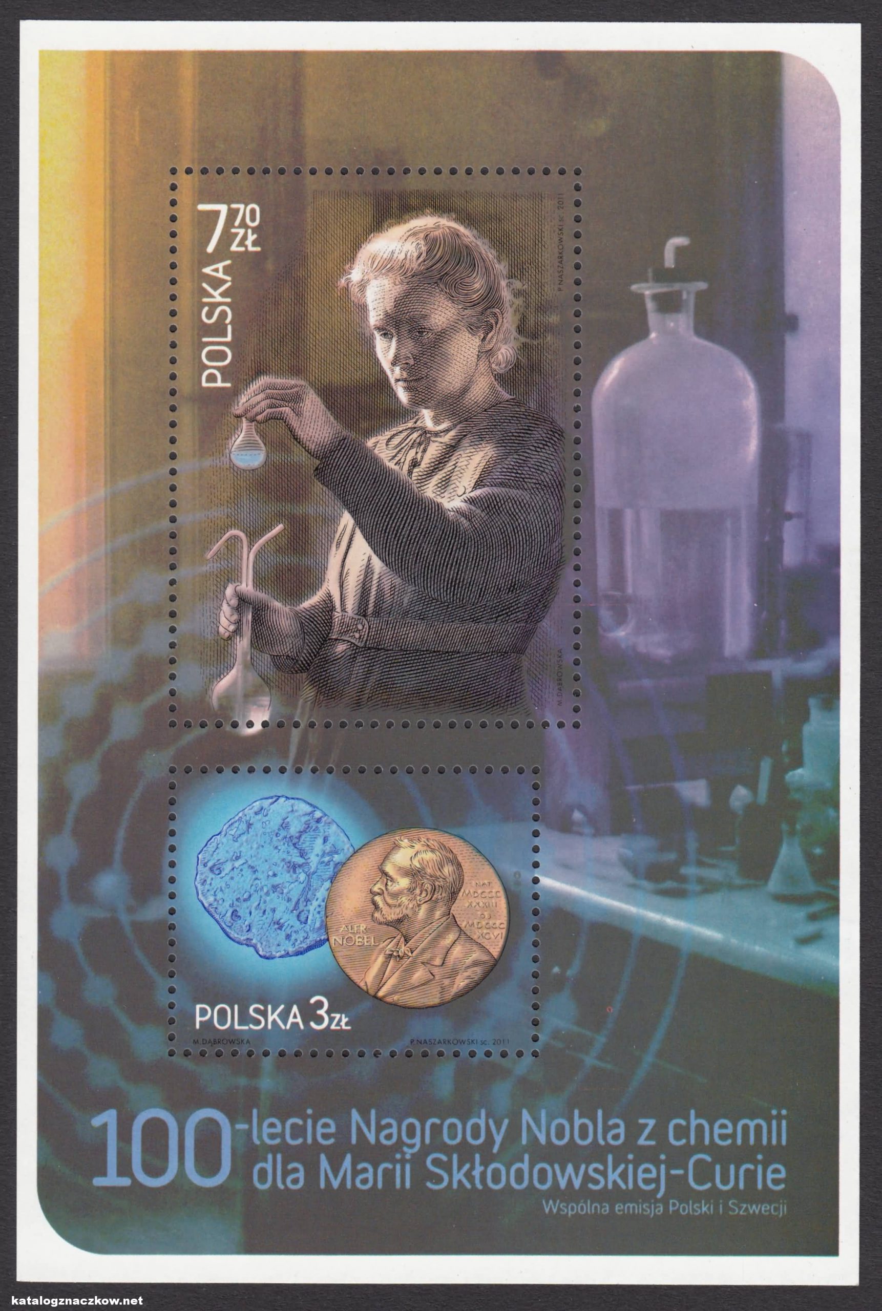 Opis: Awers medalu noblowskiego z wizerunkiem Alfreda Nobla i blaszkę radu oraz Maria Skłodowska-Curie trzymająca w dłoniach szklane kolby