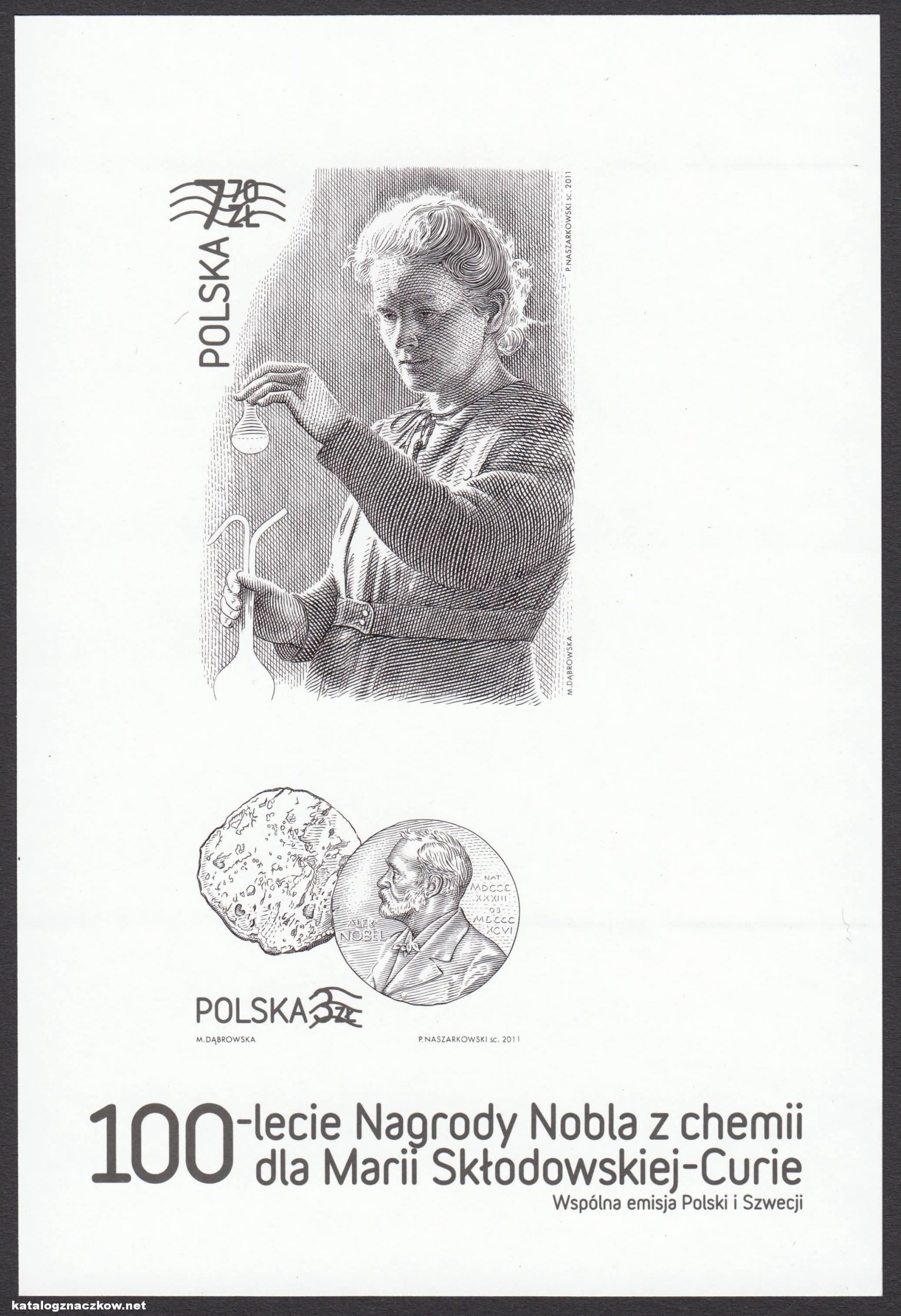 Opis: Awers medalu noblowskiego z wizerunkiem Alfreda Nobla i blaszkę radu oraz Maria Skłodowska-Curie trzymająca w dłoniach szklane kolby