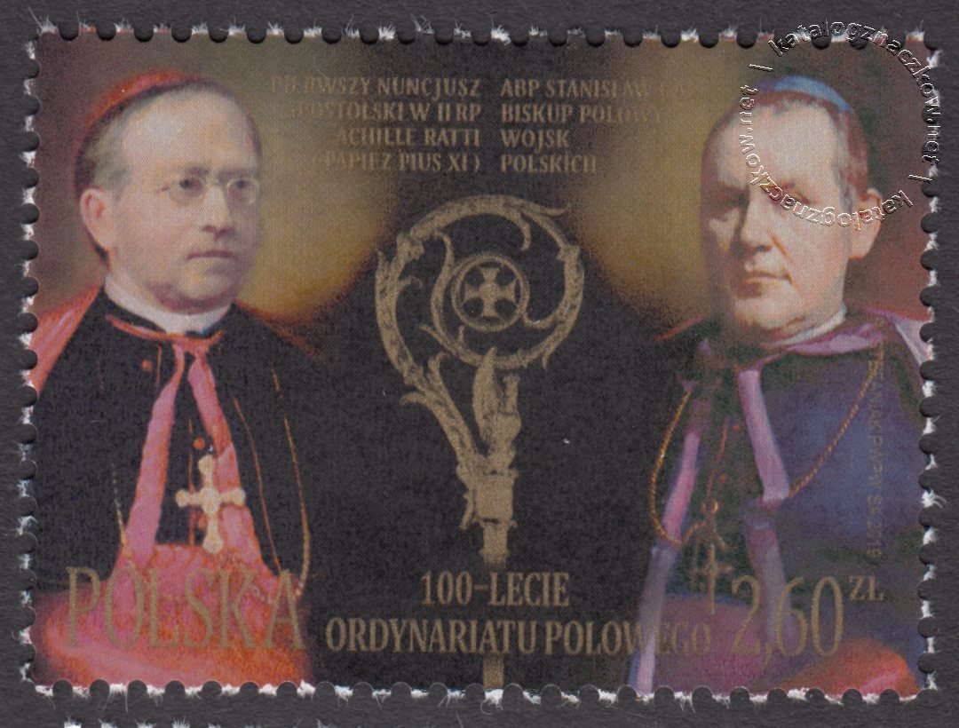 Opis: Fotografie obrazów z podobiznami: arcybiskupa Achille Rattiego i arcybiskupa Stanisława Galla, w centralnej części znaczka umieszczono zdjęcie pastorału biskupa polowego