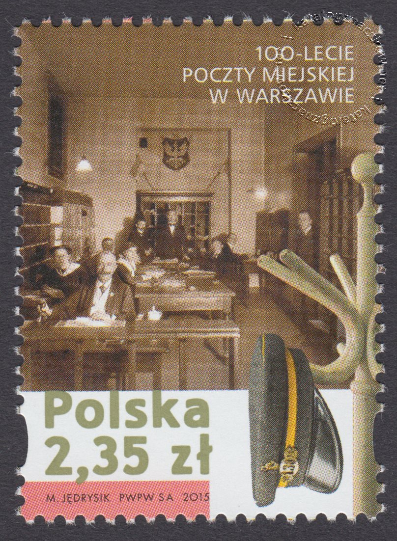 Opis: Sortownia listów Poczty Miejskiej w Warszawie z 1916 r. oraz czapka listonosza z lat 1917-1918 zawieszona na wieszaku.