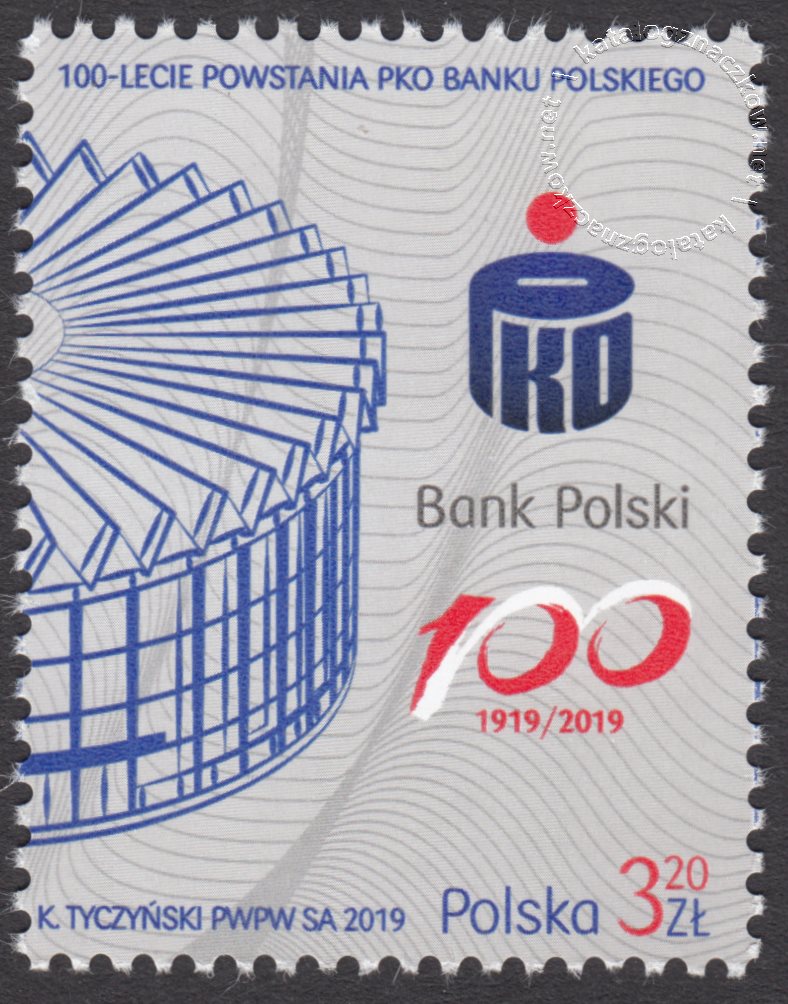 Opis: Szkic fragmentu budynku Oddziału PKO BP Rotunda w Warszawie, podstawowy logotyp PKO BP oraz logotyp PKO BP przygotowany na 100-lecie powstania tego banku