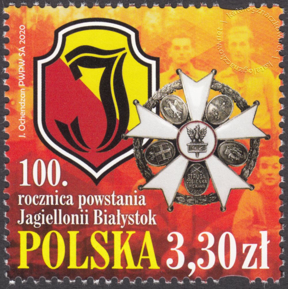 Opis: Historyczny herb Jagiellonii Białystok używany w latach 1987-1999, 2003-2006. który będzie używany od lipca 2020 roku oraz odznakę 42. Pułku Piechoty im. Generała Jana Henryka Dąbrowskiego z 1935 roku – protoplasty Jagiellonii Białystok zaś na drugim planie – fotografię drużyny piłkarskiej Jagiellonii Białystok z 1951 roku