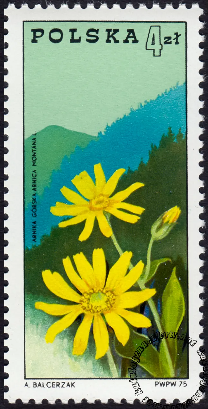 Opis: Kwiat arniki górskiej na tle beskidzkiego krajobrazu