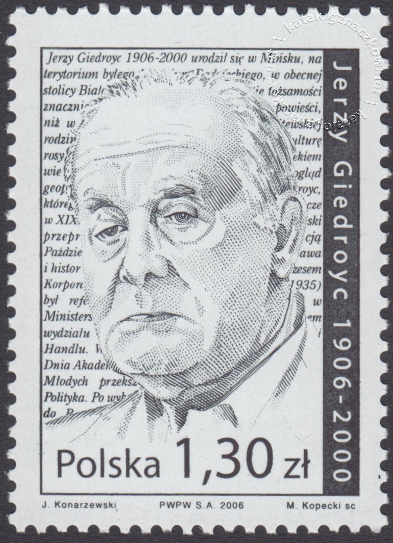 Opis: Podobizna Jerzego Giedroycia na tle fragmentu jego życiorysu