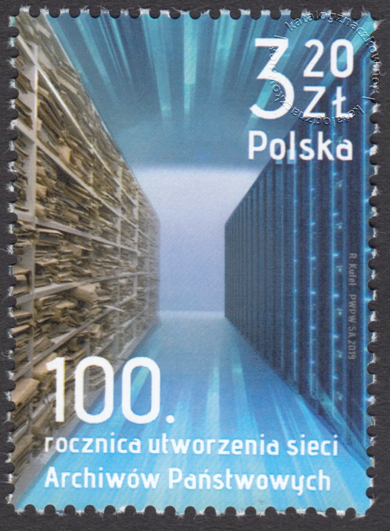 Opis: Przejście między regałami z dokumentami symbolicznie będące przejściem od dawnych do nowoczesnych metod gromadzenia, zapisywania i przechowywania zbiorów