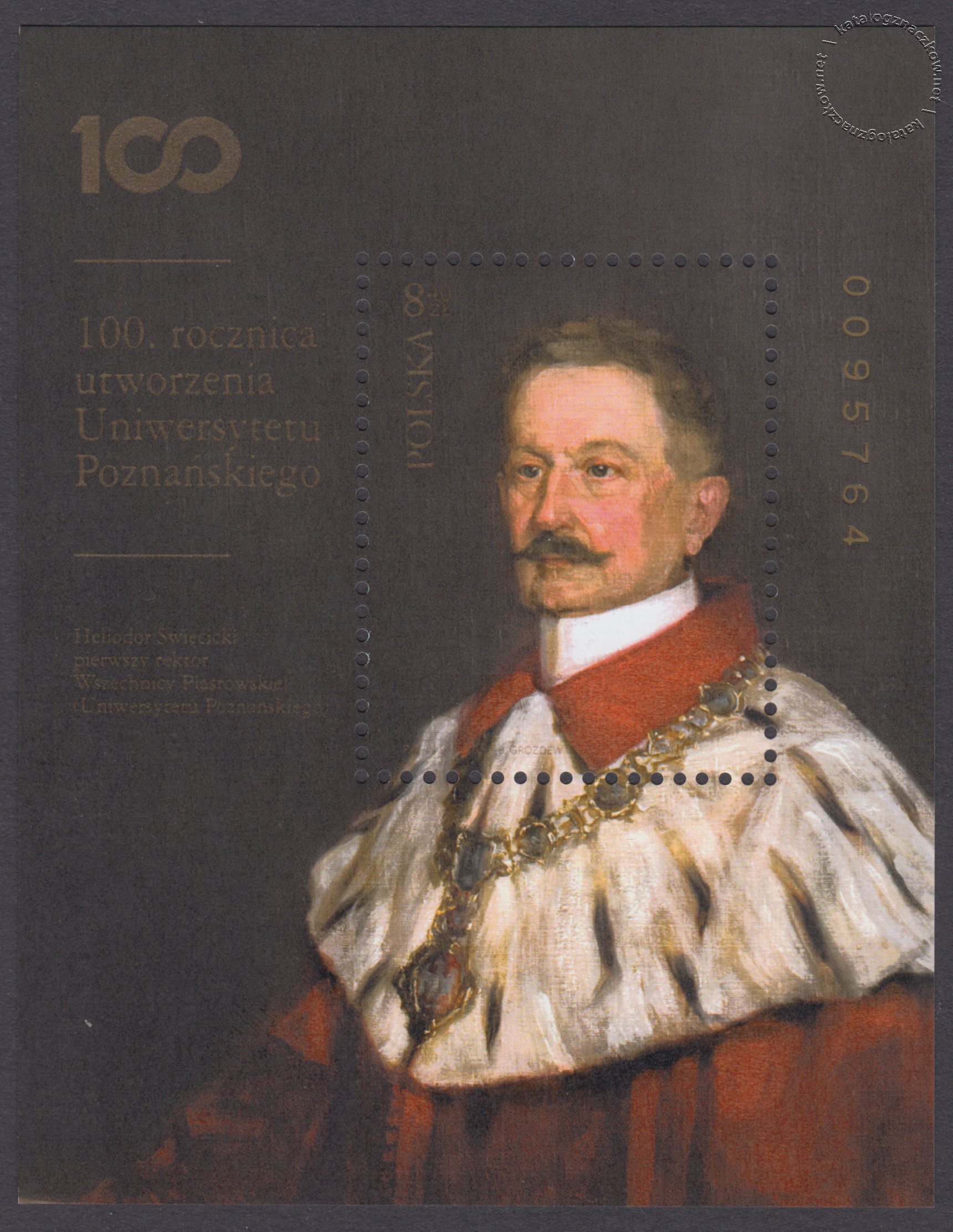 Opis: Fragment obrazu Józefa Bronisława Czarneckiego przedstawiający pierwszego rektora Uniwersytety poznańskiego – Helidora Święcickiego. Na oprawi bloku umieszczono napis: 100 rocznica utworzenia Uniwersytetu Poznańskiego; Helidor Święcicki pierwszy rektor Wszechnicy Piastowskiej (Uniwersytetu Poznańskiego)