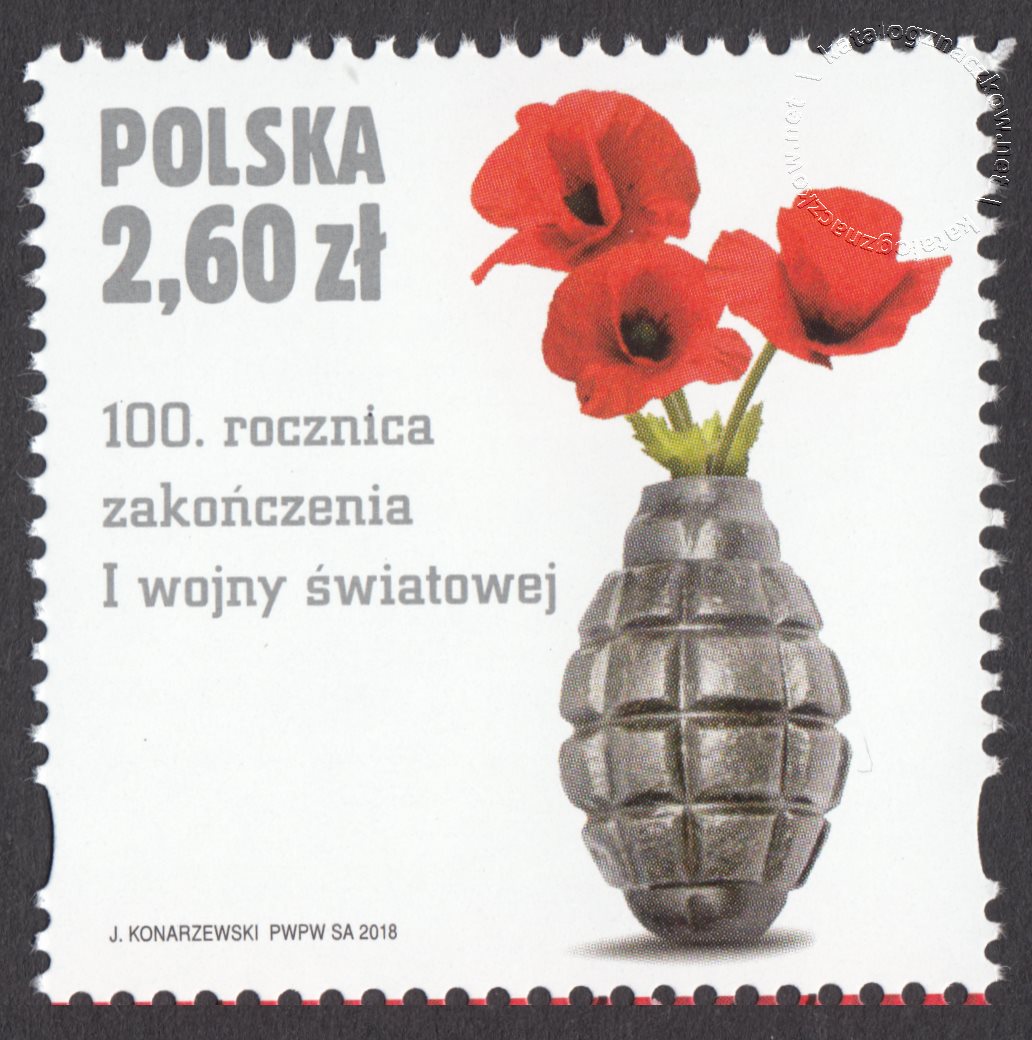 Opis: Na znaczku przedstawiono francuski granat F1, wykorzystywany w czasie I wojny światowej – jako wazon z makami stanowiącymi międzynarodowy symbol zakończenia tej wojny