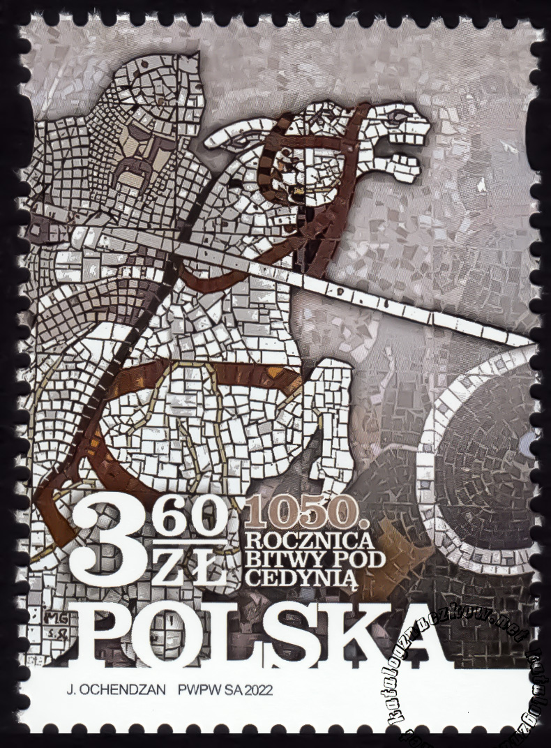 Opis: Na znaczku przedstawiono fragment mozaiki spod Góry Czcibora przedstawiający wyobrażenie bitwy pod Cedynią i napis: 1050. ROCZNICA BITWY POD CEDYNIĄ.