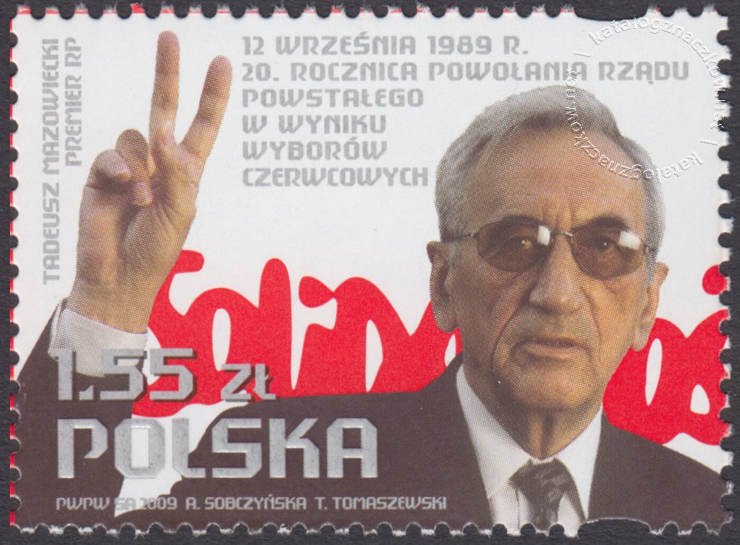 Opis: Podobizna premiera Rzeczpospolitej Polskiej Tadeusza Mazowieckiego na tle znaku „Solidarność”