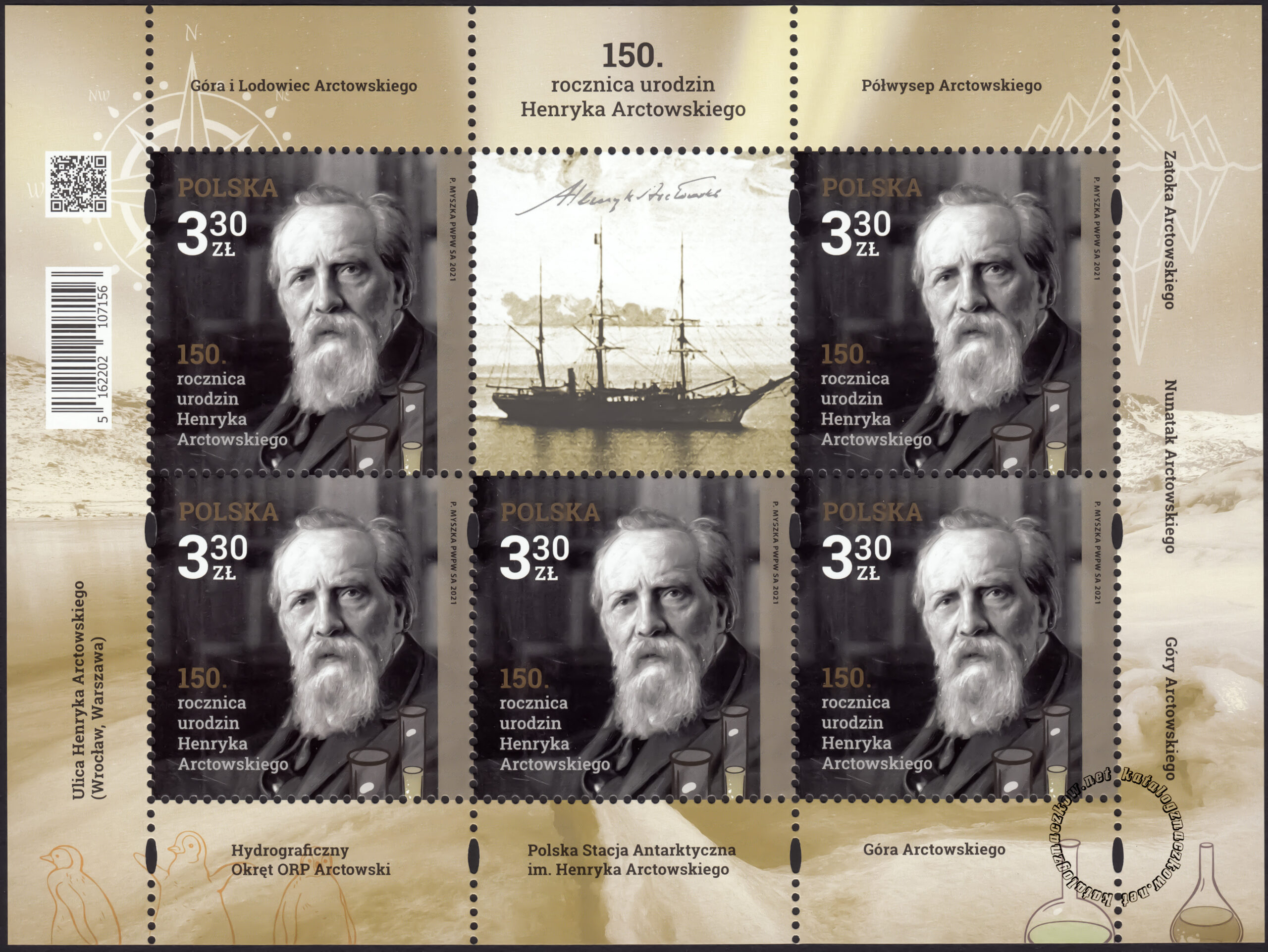 Aktualna cena, watrość, wycena, oferty sprzeaży znaczka: 150 rocznica urodzin Henryka Arctowskiego – arkusz znaczków 5162