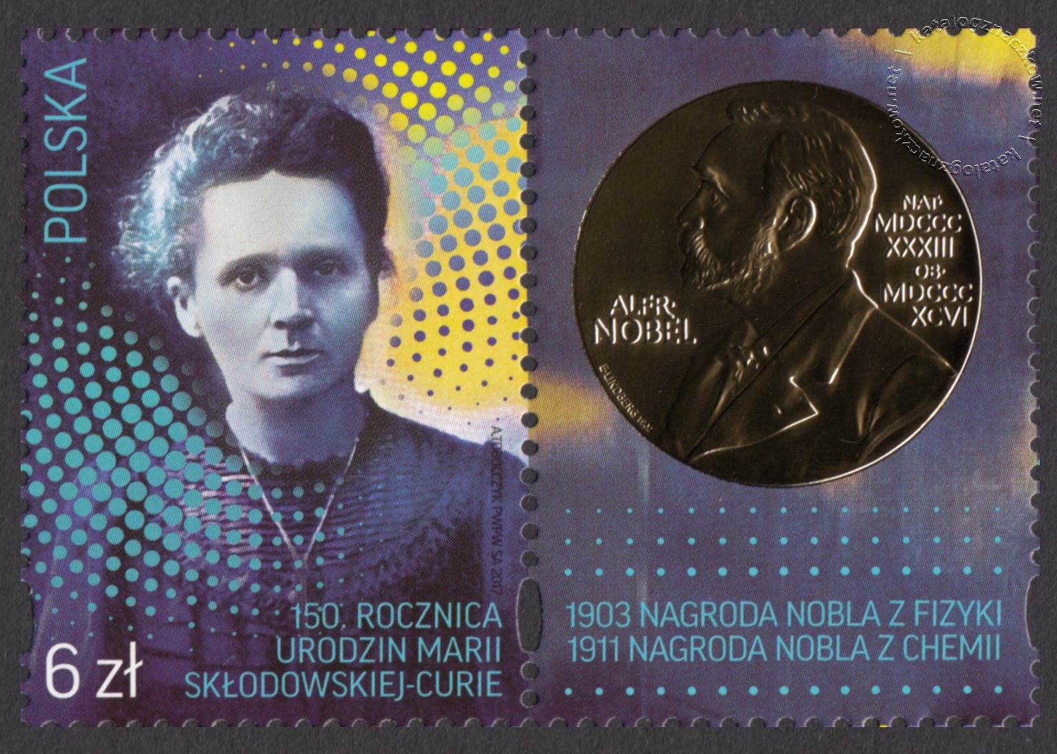 Opis: Na znaczku przedstawiono wizerunek Marii Skłodowskiej-Curie