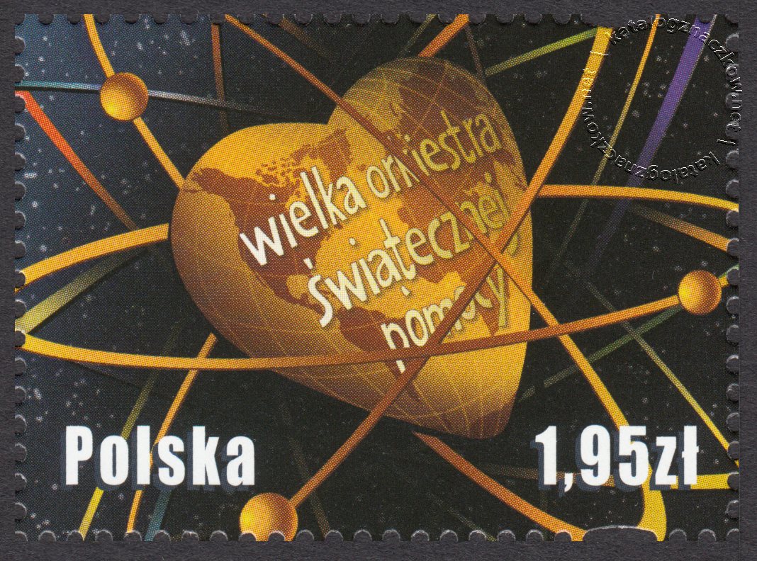 Opis: Serduszko Wielkiej Orkiestry Świątecznej Pomocy wśród symbolicznych orbit ciał niebieskich w kosmosie.