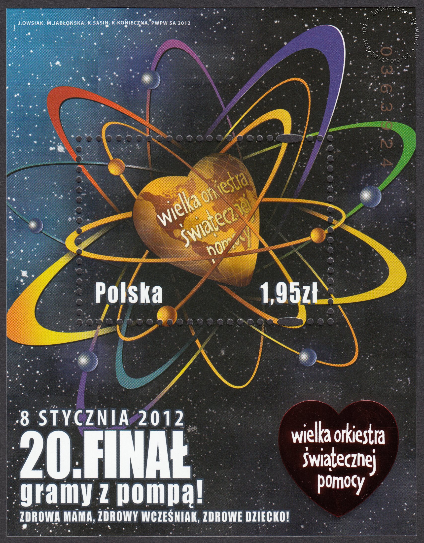 Opis: Serduszko Wielkiej Orkiestry Świątecznej Pomocy wśród symbolicznych orbit ciał niebieskich w kosmosie.
