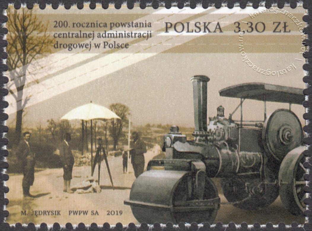 Opis: Rysunek parowego walca drogowego na tle archiwalnej fotografii przedstawiającej prace przy wytyczaniu drogi
