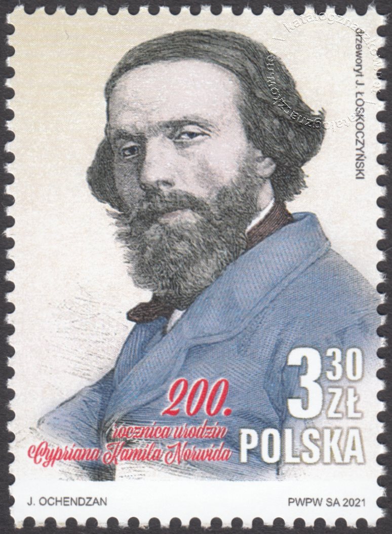 Opis: Wizerunek Cypriana Kamila Norwida, w dolnej części znaczka umieszczono nazwę emisji ,,200. rocznica urodzin Cypriana Kamila Norwida”, a w lewym dolnym rogu oznaczenie wartości: 3,30 zł i napis: Polska.