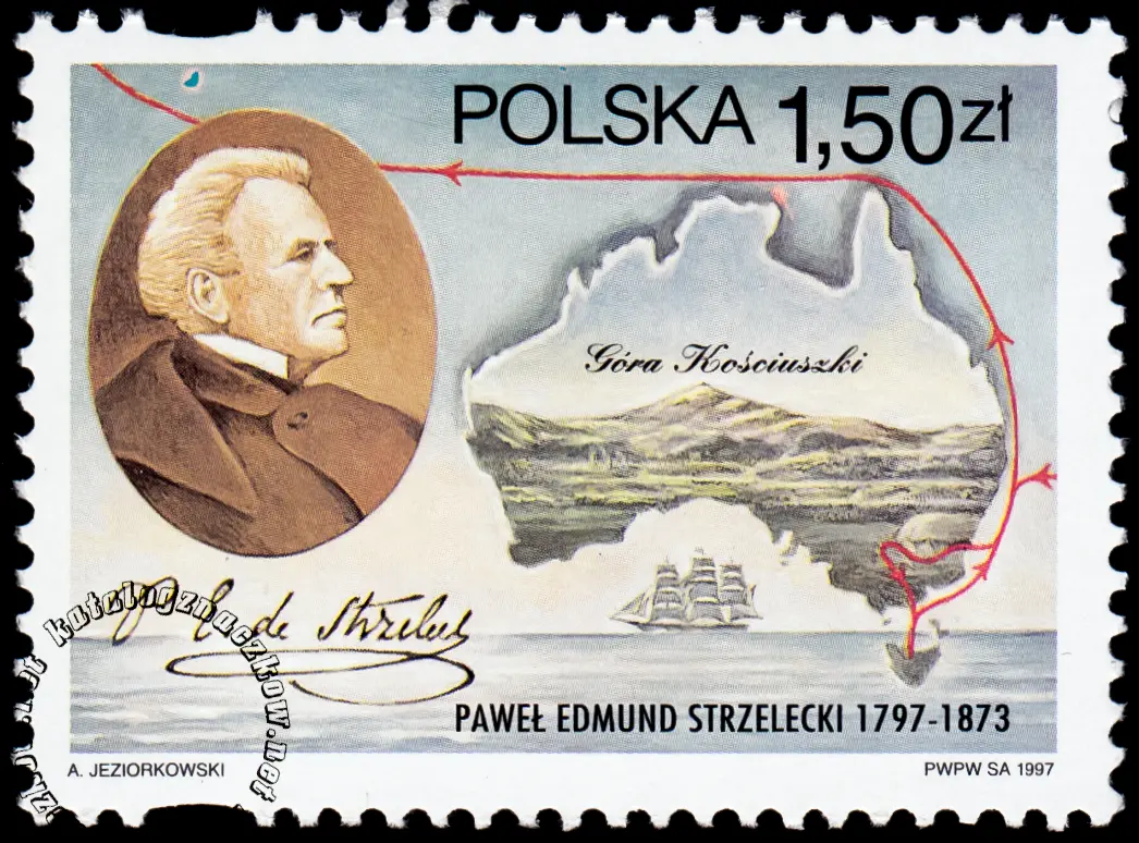 Opis: Paweł Edmund Strzelecki (1797-1873); Góra Kościuszki na tle Australii