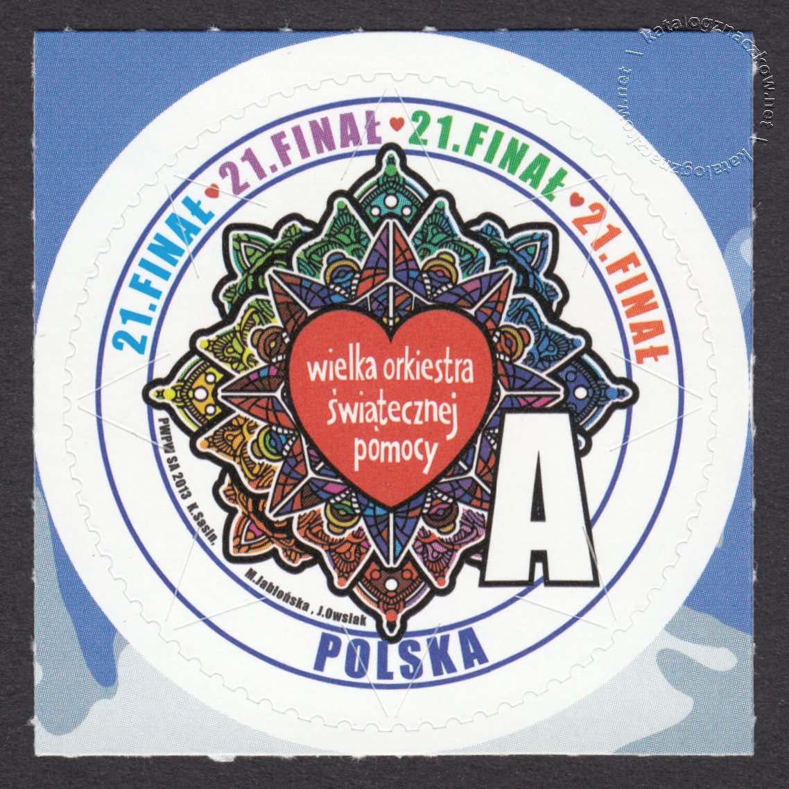 Opis: Znak Wielkiej Orkiestry Świątecznej Pomocy na tle ozdobnej rozety
