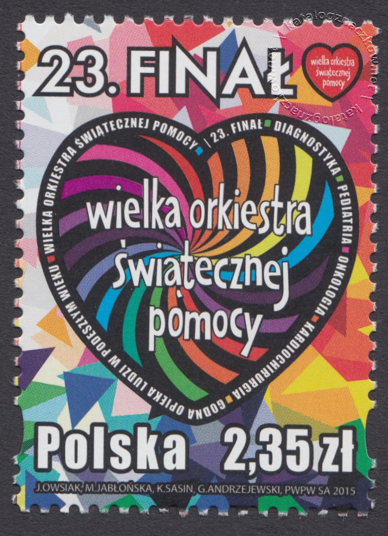 Opis: Na znaczku przedstawiono na tle kolorowych figur geometrycznych symboliczne serce z napisami: wielka orkiestra świątecznej pomocy, 23 FINAŁ, DIAGNOSTYKA, PEDIATRIA, ONKOLOGIA, KARDIOCHIRURGIA, GODNA OPIEKA LUDZI W PODESZŁYM WIEKU, WIELKA ORKIESTRA ŚWIĄTECZNEJ POMOCY.