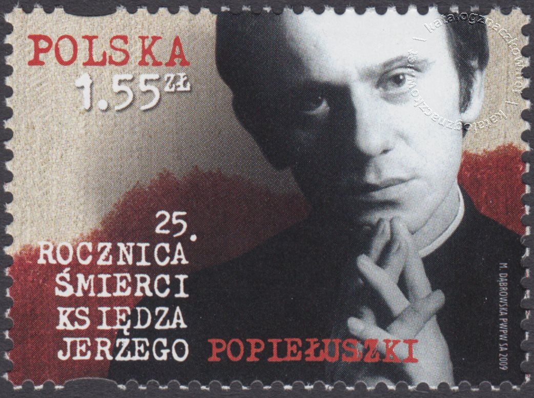 Opis: Podobizna księdza Jerzego Popiełuszki na tle płótna w kolorach symbolizujących polskie barwy narodowe