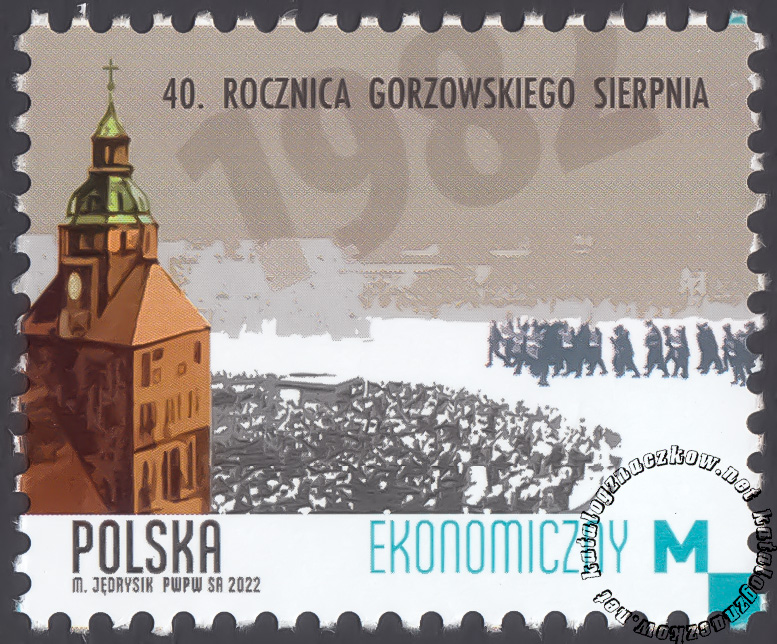 Opis: Wieża Katedry w Gorzowie Wlkp., tłum protestujących ludzi na narożniku przy katedrze i tyralierę ZOMO, w tle rok wydarzeń, tj. 1982 i napis: 40. ROCZNICA GORZOWSKIEGO SIERPNIA. Wzdłuż dolnej krawędzi umieszczono napis: POLSKA i oznaczenie: EKONOMICZNY M, co odpowiada wartości nominalnej znaczka pocztowego właściwego do uiszczania opłaty za ekonomiczną przesyłkę listową nierejestrowaną w obrocie krajowym w formacie M i ekonomiczną kartkę pocztową w obrocie krajowym.