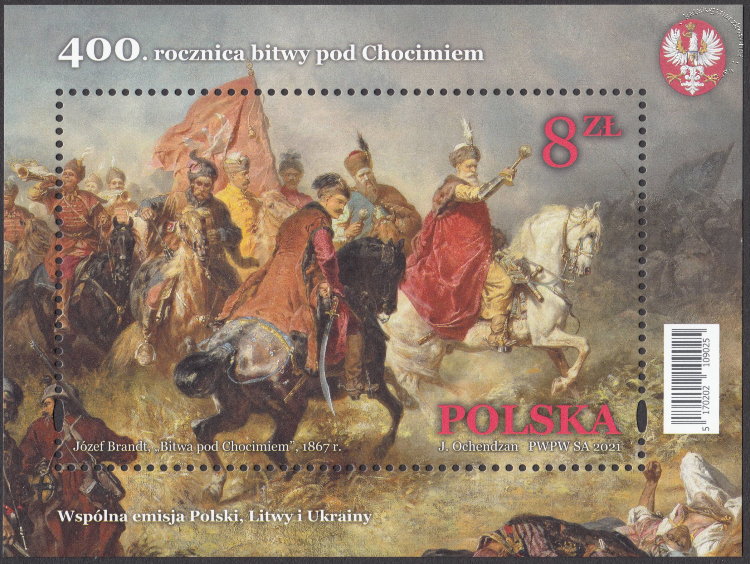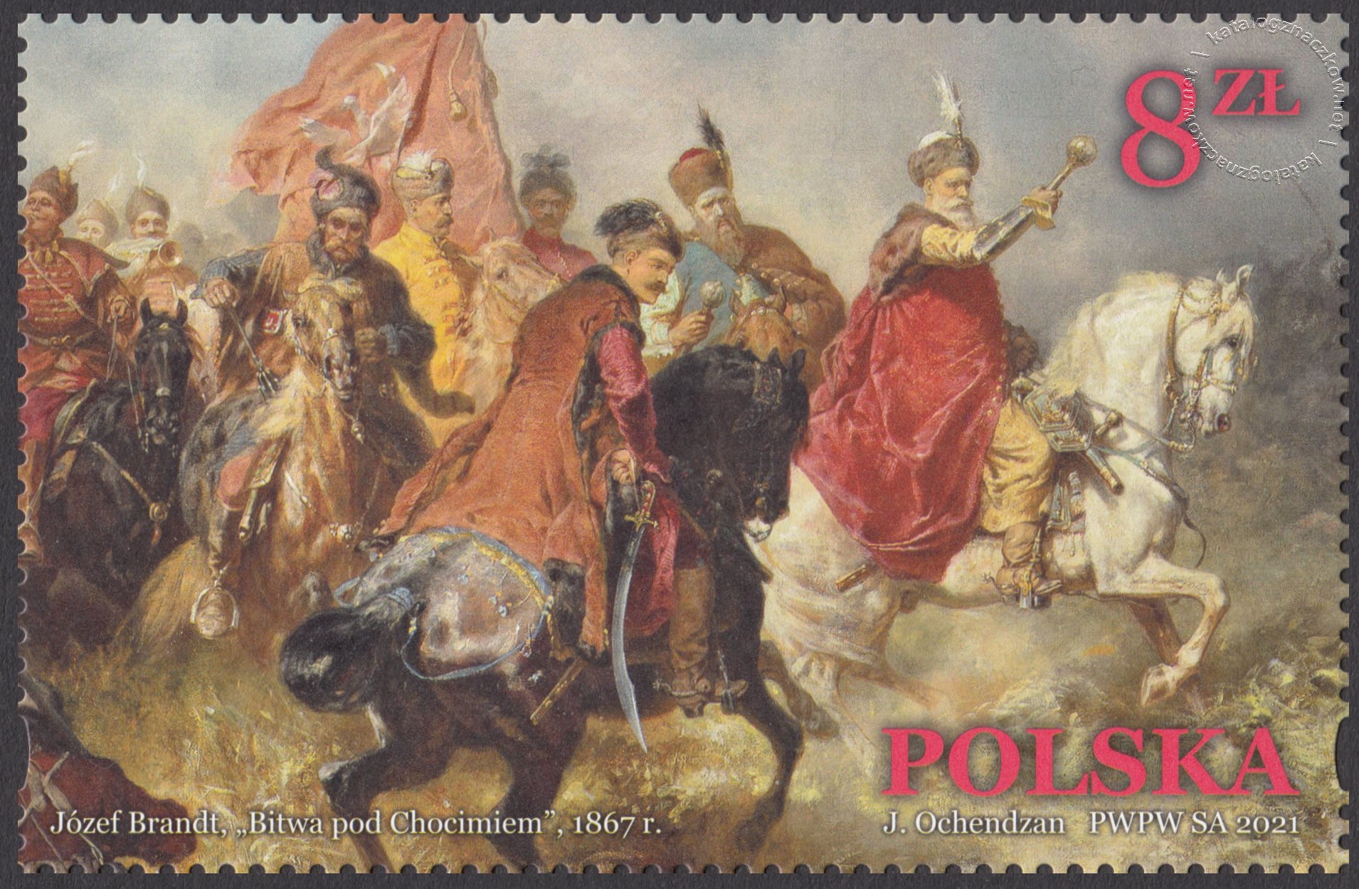 Opis: Na znaczku przedstawiono centralny fragment obrazu Józefa Brandta „Bitwa pod Chocimiem”.