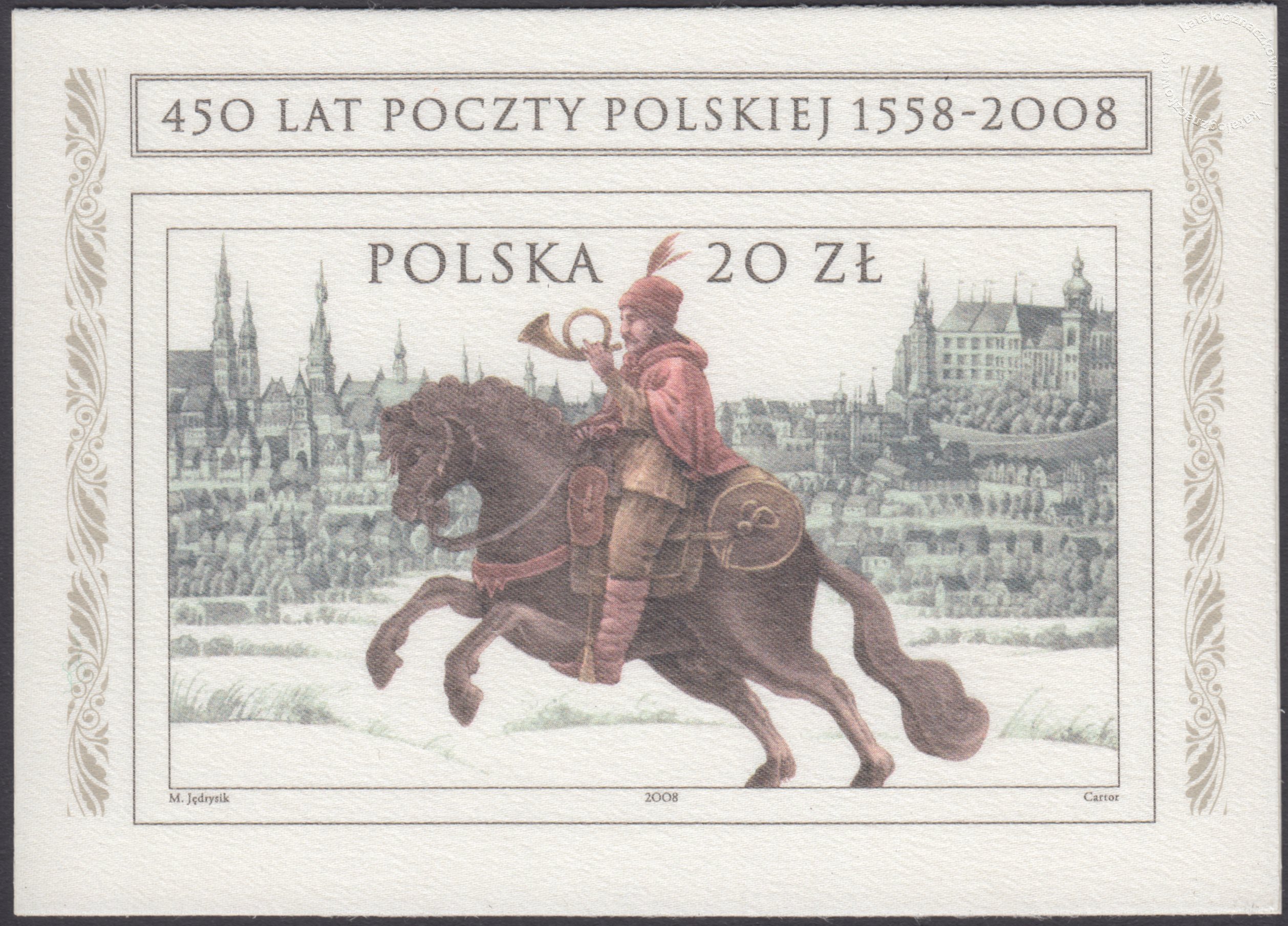 Opis: Goniec konny z pocztą na tle panoramy Krakowa z końca XVI w.