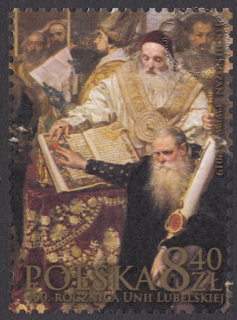 Opis: Na znaczku przedstawiono fragment obrazu Jana Matejki z 1869 roku -Unia Lubelska. Na oprawie bloku umieszczono tekst IŻ JUŻ KRÓLESTWO POLSKIE I WIELGIE KSIĘSTWO LITEWSKIE JEST JEDNO NIEROZDZIELNE I NIEROŻNE CIAŁO, A TAKŻE NIEROŻNA ALE JEDNA A SPOLNA RZECZPOSPOLITA, KTORA SIĘ Z DWU PAŃSTW I NARODÓW W JEDEN LUD ZNIOSŁA I SPOIŁA. FRAGMENT AKTU UNII LUBELSKIEJ Z 1 LIPCA 1569 R, a nad nim lata: 1569-2019
