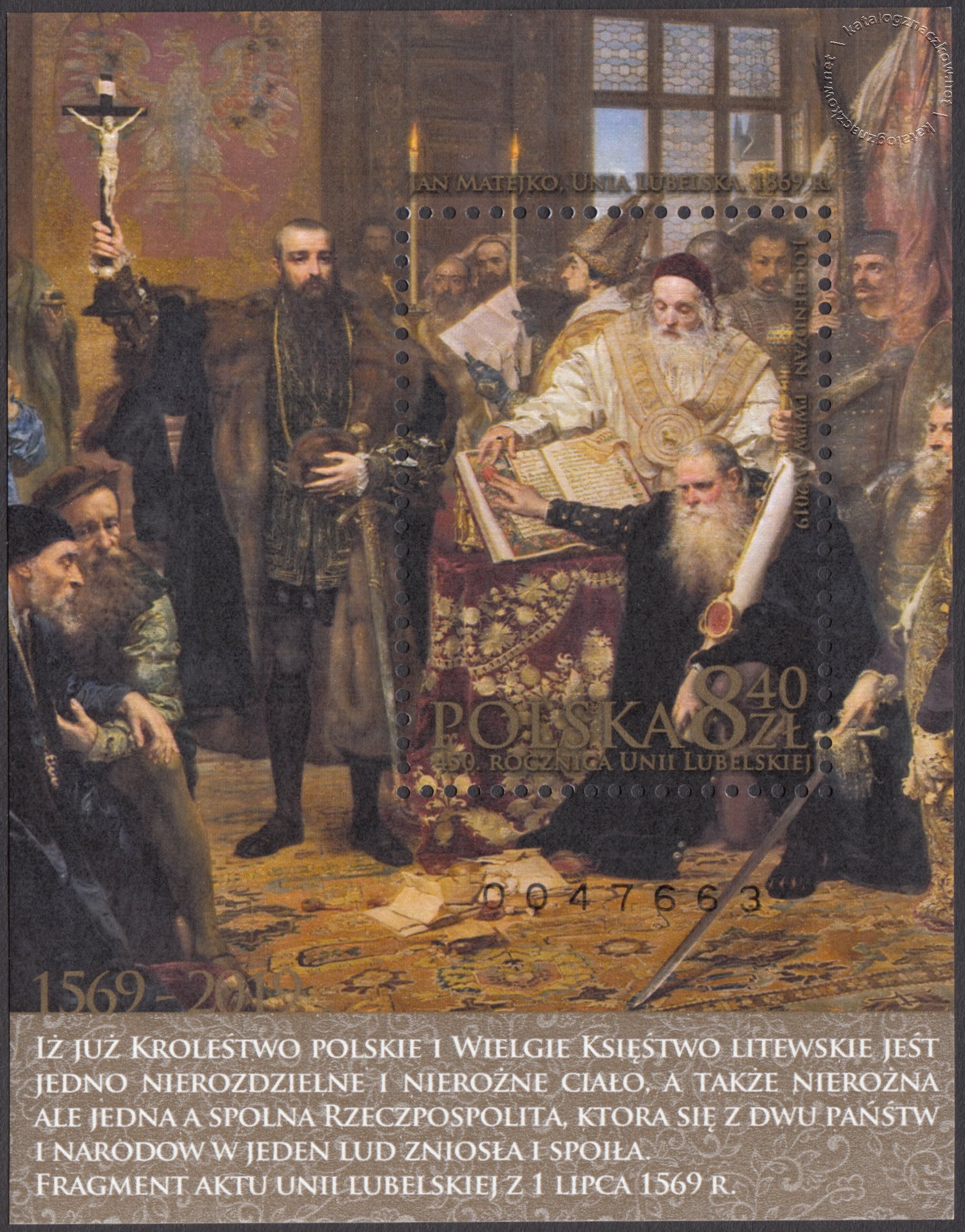 Opis: Na znaczku przedstawiono fragment obrazu Jana Matejki z 1869 roku -Unia Lubelska. Na oprawie bloku umieszczono tekst IŻ JUŻ KRÓLESTWO POLSKIE I WIELGIE KSIĘSTWO LITEWSKIE JEST JEDNO NIEROZDZIELNE I NIEROŻNE CIAŁO, A TAKŻE NIEROŻNA ALE JEDNA A SPOLNA RZECZPOSPOLITA, KTORA SIĘ Z DWU PAŃSTW I NARODÓW W JEDEN LUD ZNIOSŁA I SPOIŁA. FRAGMENT AKTU UNII LUBELSKIEJ Z 1 LIPCA 1569 R, a nad nim lata: 1569-2019