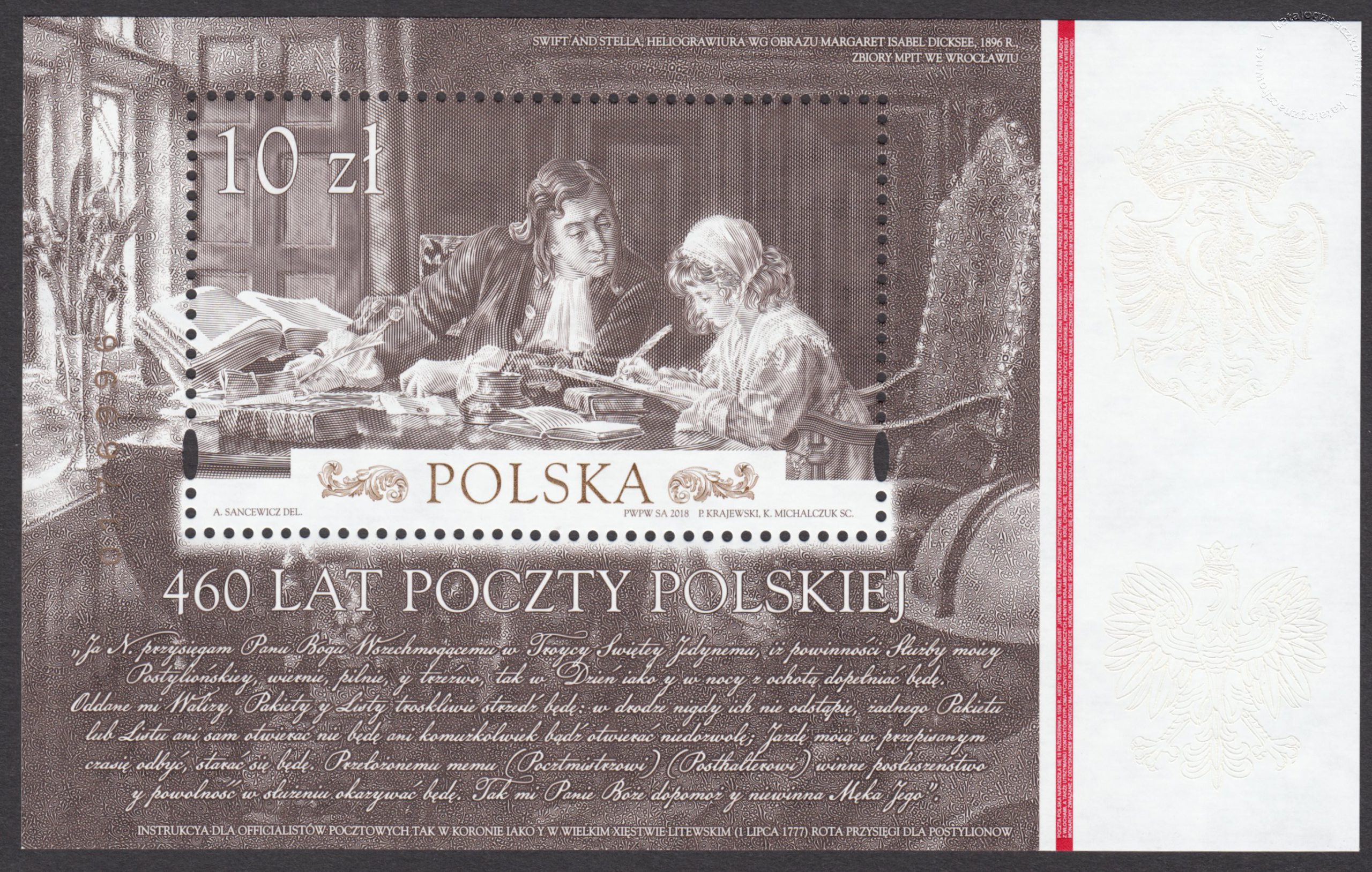 Opis: Na znaczku przedstawiono część centralną heliograwiury według obrazu Margaret Isabel Dicksee Swift and Stella ze zbiorów Muzeum Poczty i Te l e k o m u n i k a c j i w e W r o c ł a w i u . N a o p r a w i e b l o k u przedstawiono heliograwiurę według obrazu Margaret Isabel Dicksee Swift and Stella ze zbiorów Muzeum Poczty i Telekomunikacji we Wrocławiu, nazwę emisji: 460 LAT POCZTY POLSKIEJ? oraz tekst roty przysięgi dla pocztylionów, zawarty w Instrukcji z dnia 1 lipca 1777 roku
