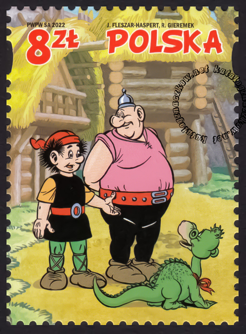 Opis: Na znaczku przedstawiono postacie Kajka i Kokosza oraz Milusia, bohaterów komiksu autorstwa Janusza Christy.