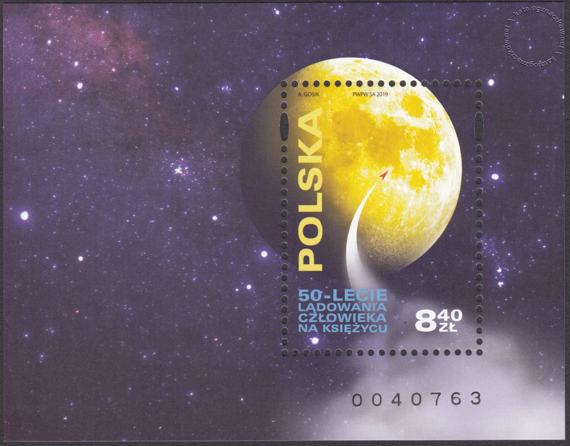 Opis: Księżyc na tle gwiaździstego nieba, w części centralnej Księżyca umieszczono czerwoną strzałkę symbolizującą miejsce lądowania człowieka na Księżycu