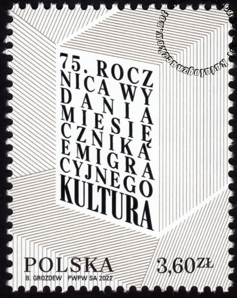 Opis: Na znaczku przedstawiono metaforycznie wszystkie wydania miesięcznika od pierwszego do ostatniego numeru, z napisem ,,75. rocznica wydania miesięcznika emigracyjnego ,,Kultura”.