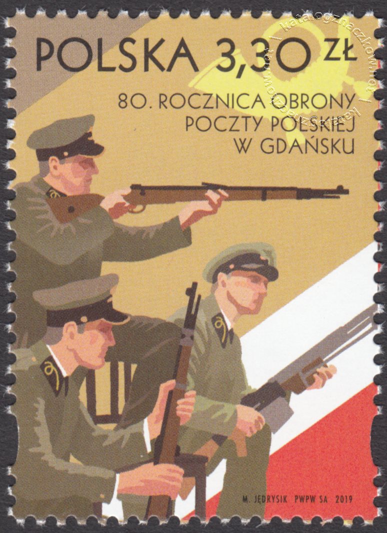 Opis: Trzy postaci uzbrojonych pracowników Poczty Polskiej w mundurach