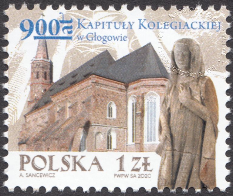 Opis: Współczesny widok kolegiaty, będącej obecnie siedzibą parafii p.w. Wniebowzięcia Najświętszej Marii Panny w Głogowie, powstałej w miejscu wcześniejszych kościołów grodowych; z prawej strony znaczka umieszczono posąg księżnej głogowskiej Salomei, z przełomu XIII i XIV wieku