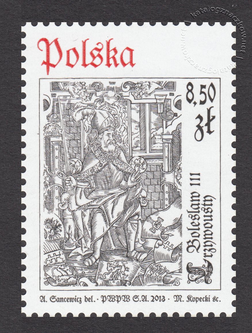 Opis: Na znaczku i bloku przedstawiono Bolesława III Krzywoustego wg rycin z Kroniki Polskiej Marcina Bielskiego