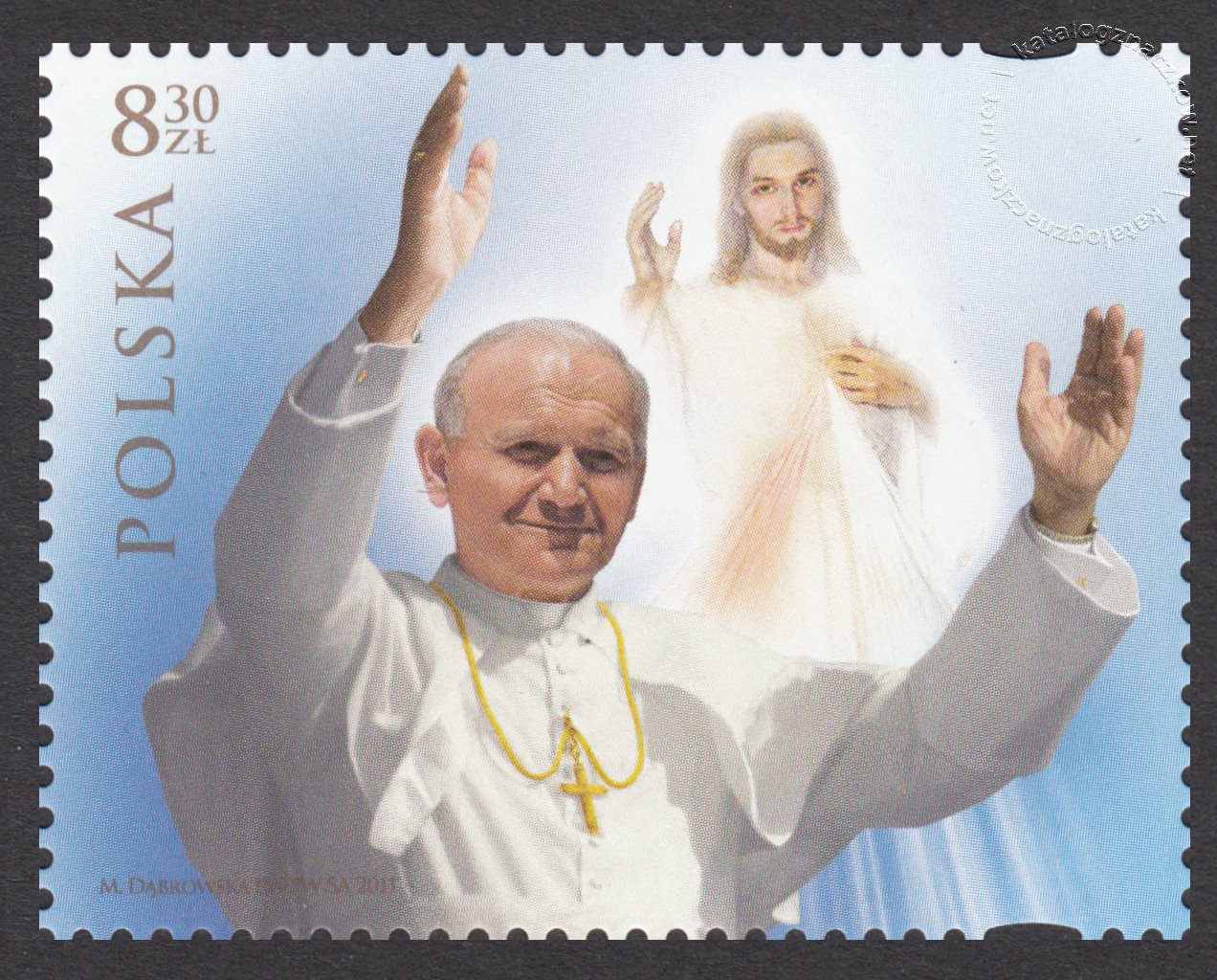 Opis: Podobizna Papieża Jana Pawła II na tle sylwetki Jezusa Miłosiernego wg obrazu z Sanktuarium Bożego Miłosierdzia w Krakowie – Łagiewnikach