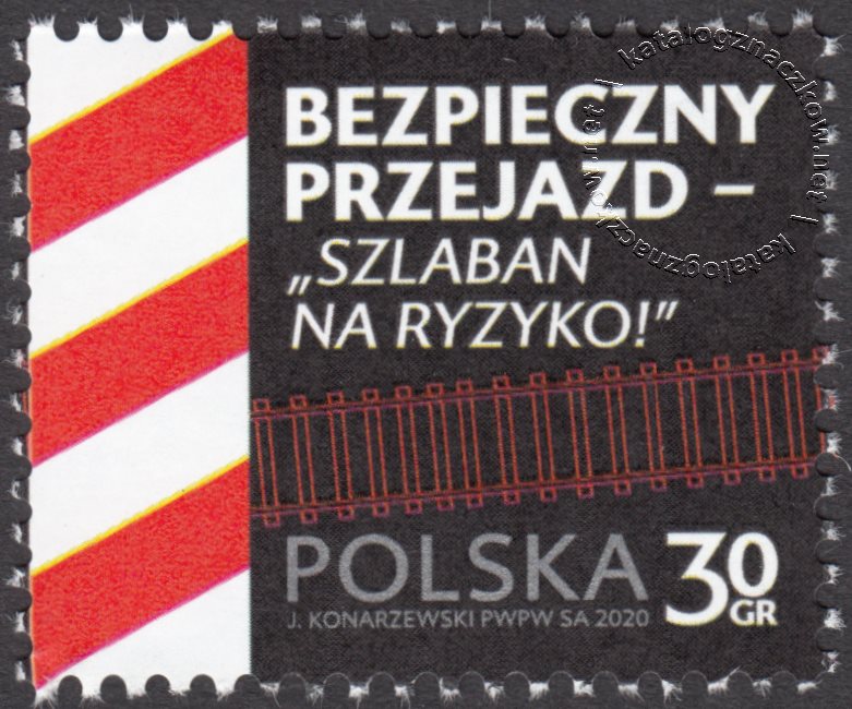 Opis: Po lewej skonie, przedstawiono słupek wskaźnikowy informujący o zbliżaniu się do przejazdu kolejowo-drogowego, a w środkowej części – czerwone tory kolejowe na czarnym tle