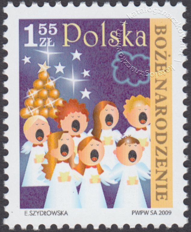 Opis: Dzieci śpiewające kolędy na tle choinki i gwiazdek