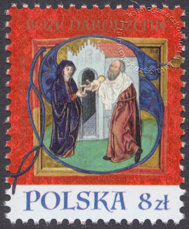 Opis: Miniatura inicjałowa pochodząca z ok.1500 r. ,,Mszału Olbrachtowego”- scena ,,Ofiarowania Pańskiego” ze zbiorów Archiwum Archidiecezjalnego w Gnieźnie. Wzdłuż dolnej krawędzi znaczka umieszczono napis: POLSKA oraz oznaczenie wartości 8 zł , a wzdłuż górnej krawędzi znaczka umieszczono napis BOŻE NARODZENIE