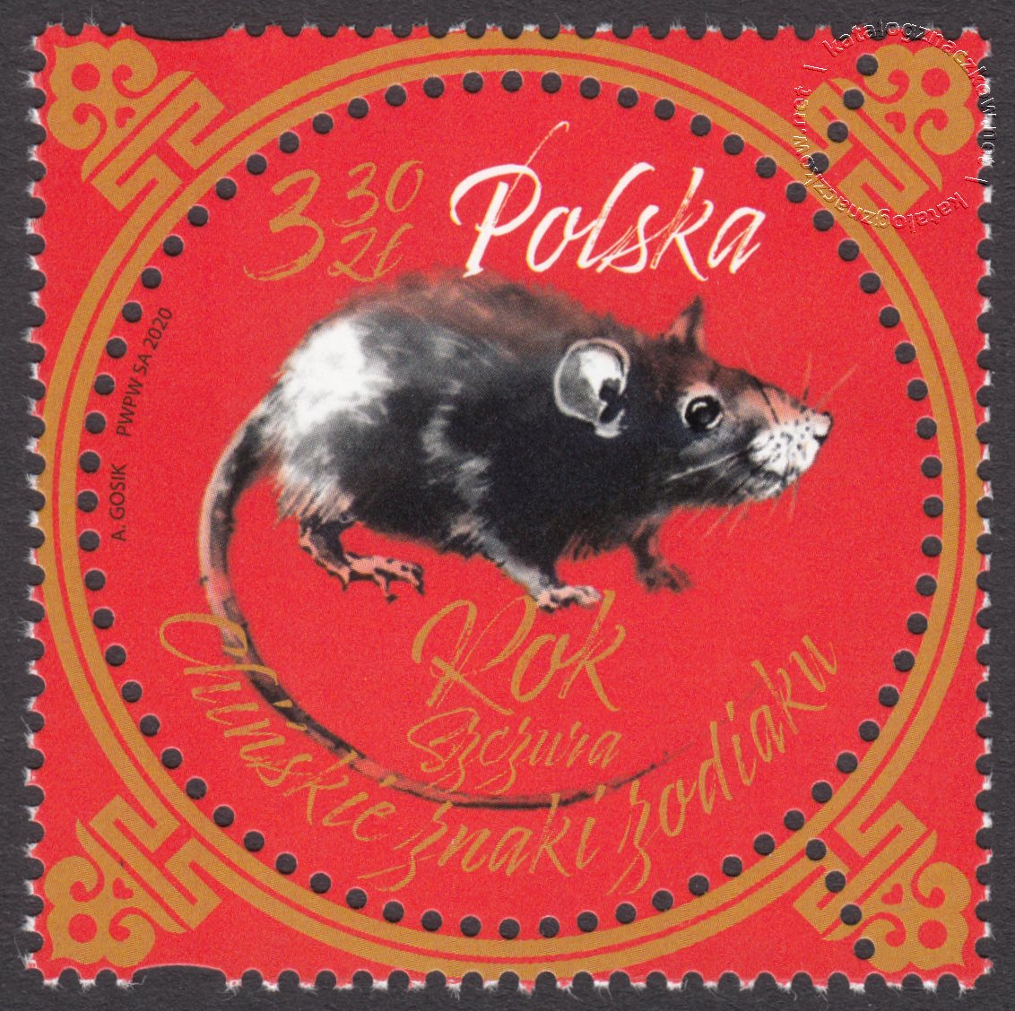 Opis: Grafika przedstawiająca szczura, wzdłuż dolnej krawędzi napis – Rok Szczura Chińskie znaki Zodiaku