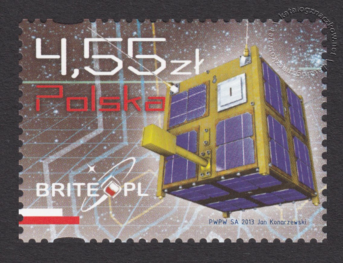 Opis: Satelita BRITE-PL. W tle bloku przedstawiono gwiazdy i symboliczne linie, ilustrujące przesyłanie informacji z satelity na Ziemię, napisy: Heweliusz, Drugi polski satelita naukowy i Kometa 103/P Hartley niedaleko dwóch gromad otwartych gwiazd h i chi Persei.