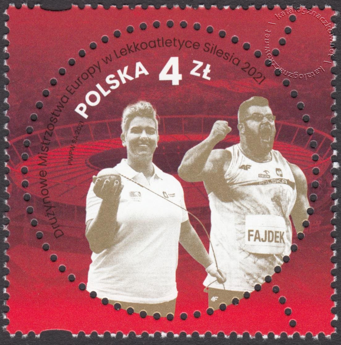 Opis: Na znaczku umieszczono nazwę emisji: Drużynowe Mistrzostwa Europy w Lekkoatletyce Silesia 2021 oraz napis: Polska i oznaczenie wartości: 4 zł, w środkowej części znaczka przedstawiono sylwetki: Anity Włodarczyk i Pawła Fajdka, a w tle znaczka widnieje budynek Stadionu Śląskiego w Chorzowie.