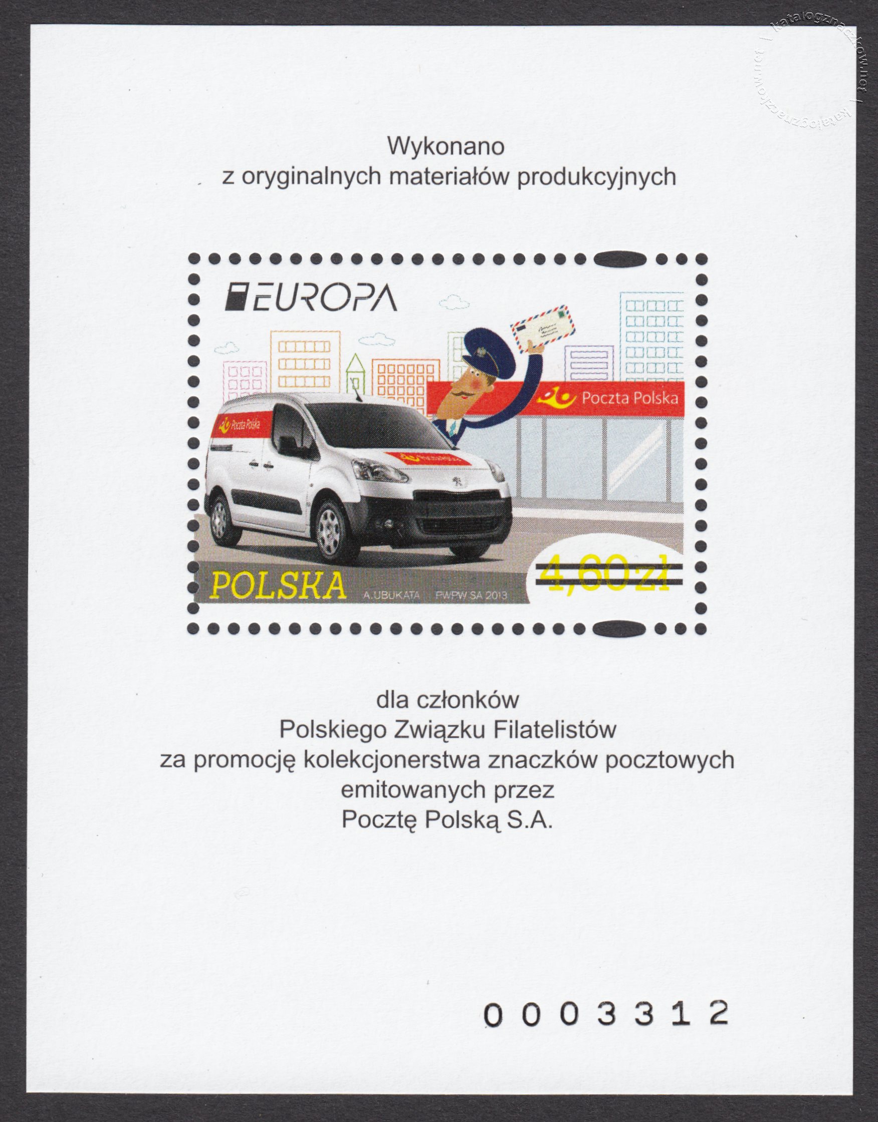 Opis: Wydanie specjalne Poczty Polskiej w postaci nowodruku znaczka emisji Europa z 2013 roku w formie bloku, przeznaczone tylko dla członków PZF.