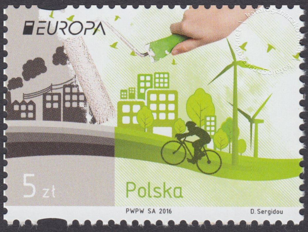 Opis: Na znaczku przedstawiono w sposób symboliczny ideę Think Green