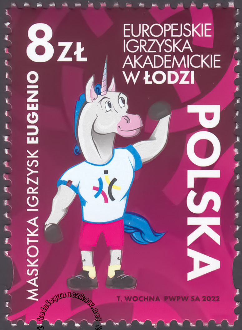 Opis: Maskotka Europejskich Igrzysk Akademickich w Łodzi – jednorożec Eugenio.